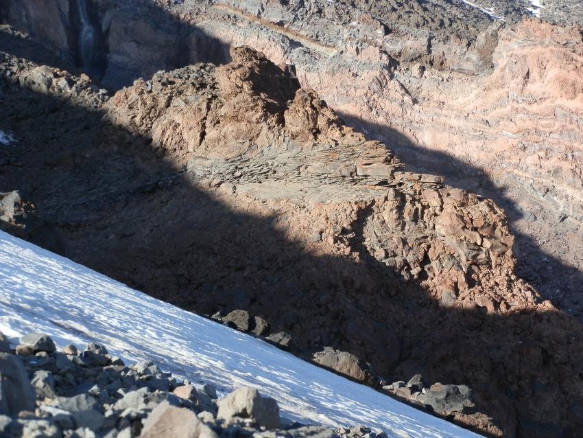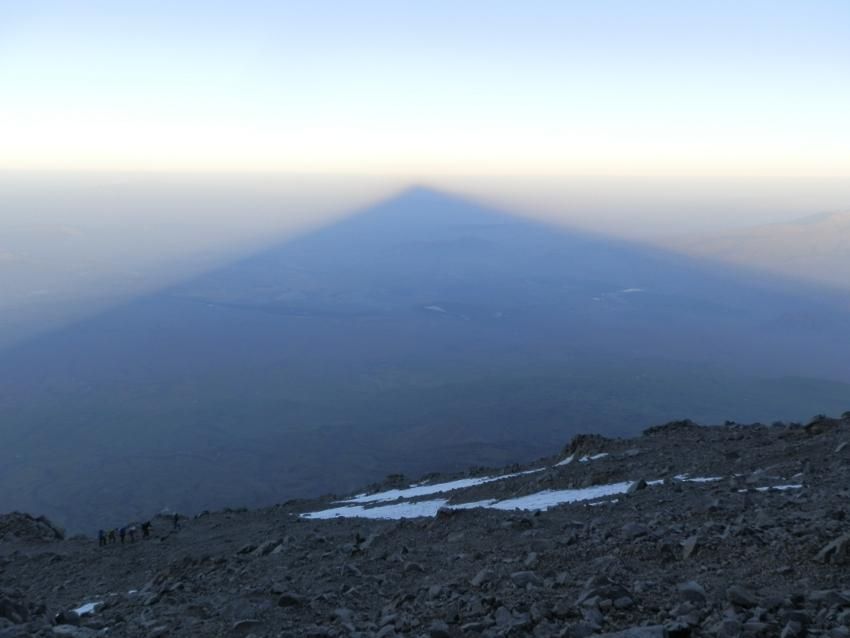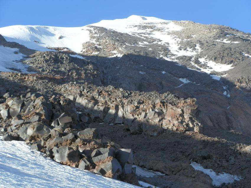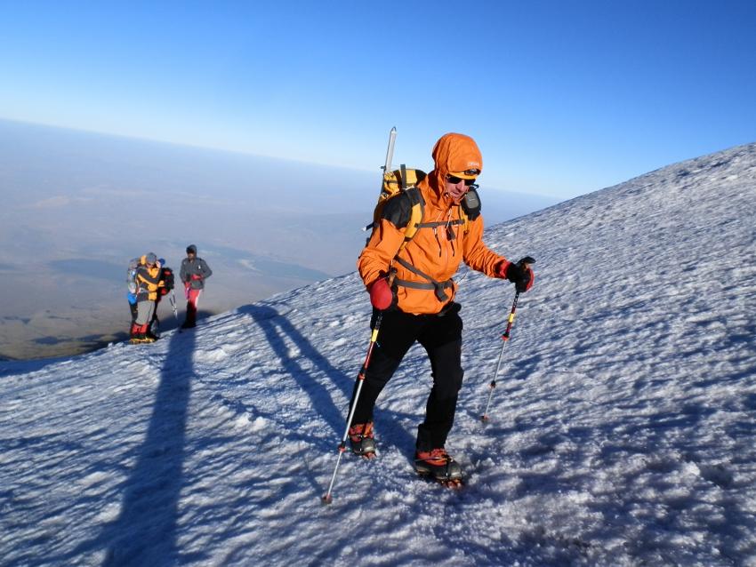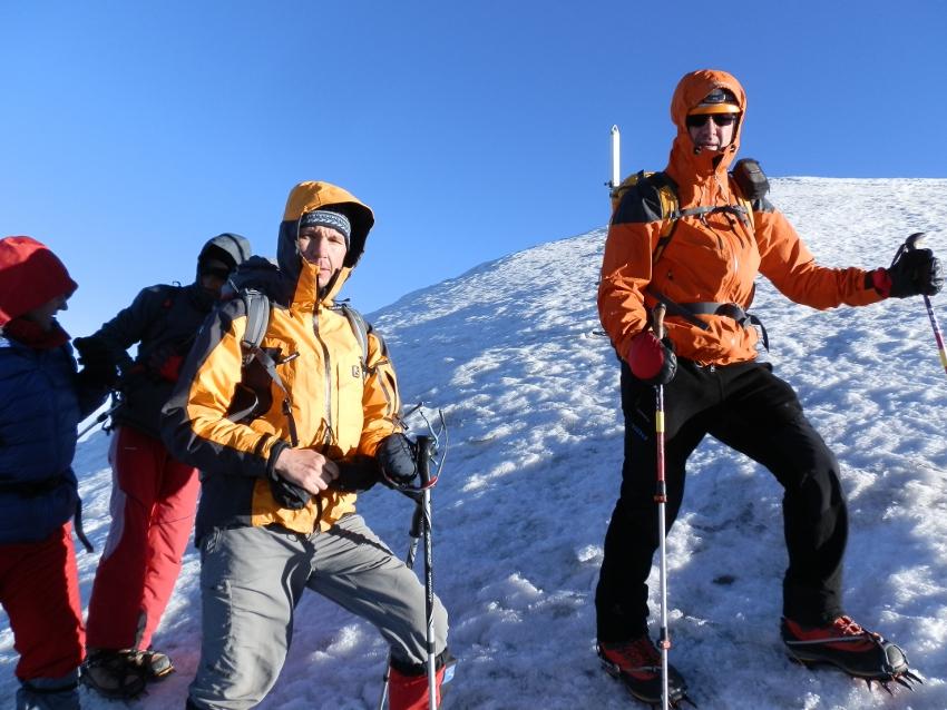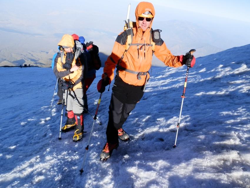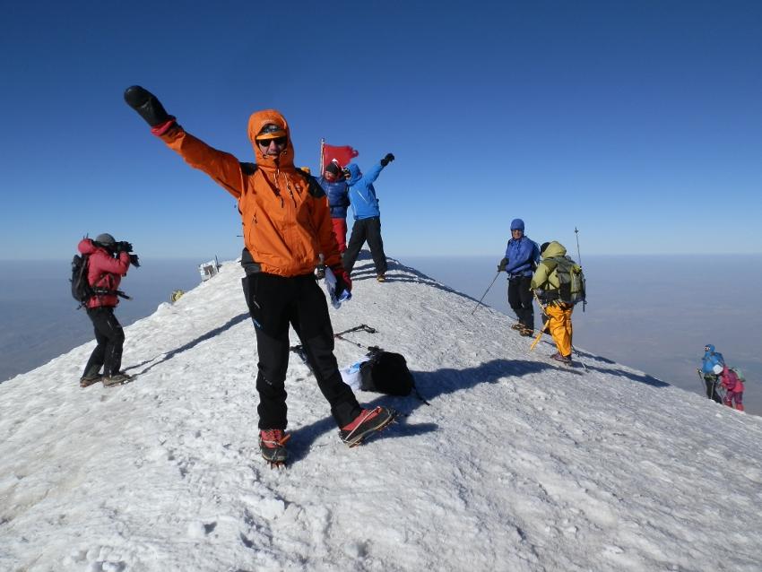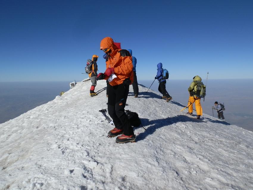 17 Temmuz 2013 Çarşamba: Gece kalktığımızda gökyüzü pırıl pırıldı ve elimizi uzattığımızda dokunacakmışızcasına yakın olan yıldızları seyretmek muhteşemdi. Uzun zamandır heyecanla beklediğim ve kendimi hazırlamaya çalıştığım, zirveye tırmanış vakti gelmişti. Kahvaltımızı yapıp, teknik malzemelerimizi kuşandık ve saat 02:10 gibi tırmanışa başladık. Tırmanış faaliyetindeki en sıkıntılı yer 4200 – 4800 aralığıdaki bu kayalık bölgeydi. Tırmanış güzergahımızdaki karlar güzdüz eriyip kayaların yüzeyini ıslattığından, gece oluncada düşen ısı nedeniyle donduğundan oldukça kaygan bir zemin oluşturuyorlardı ve tırmanış esnasında kayıp sorun yaşamamıza neden olabilecek durumdaydı. Kafa lambalarımızın ışığında bu sıkıntılı bölgeyi kazasız geçip buzula ulaştığımızda hava yavaş yavaş aydınlanmaya başlamıştı. Buzul başlangıcında kramponlarımızı takıp, şiddetlenen rüzgara önlem olarak yüzümüzün açıkta kalan yerlerini kapatarak, tırmanışımıza devam ettik. Güneş ışınları kendini göstermeye başladığında, yan geçişi tamamlayıp düzlüğe çıkmıştık. Rüzgar şiddetini iyice arttırdığından ayakta dengede durmakta oldukça zorlanıyorduk. Ancak biraz üzerimdeki zirve bayrağını gördüğümde tüm yorgunluğum bir anda yok olmuştu. On dakika kadar daha tırmandığımda artık zirvedeydim ve başarmıştım. Saatim ise 06:40’ı gösteriyordu.Tam zirve noktasında yaklaşık beş dakika kadar çevremde dönerek, gözümün görebildiği kadar uzakları, komşu ülkeleri seyretmeye çalıştım. Tabiiki zirvede kalabilme sürem kısıtlı olduğundan, hemen flamalarımı açıp, bu anı ölümsüz kılacak fatoğraflarımı çektim ve inişe başladım.