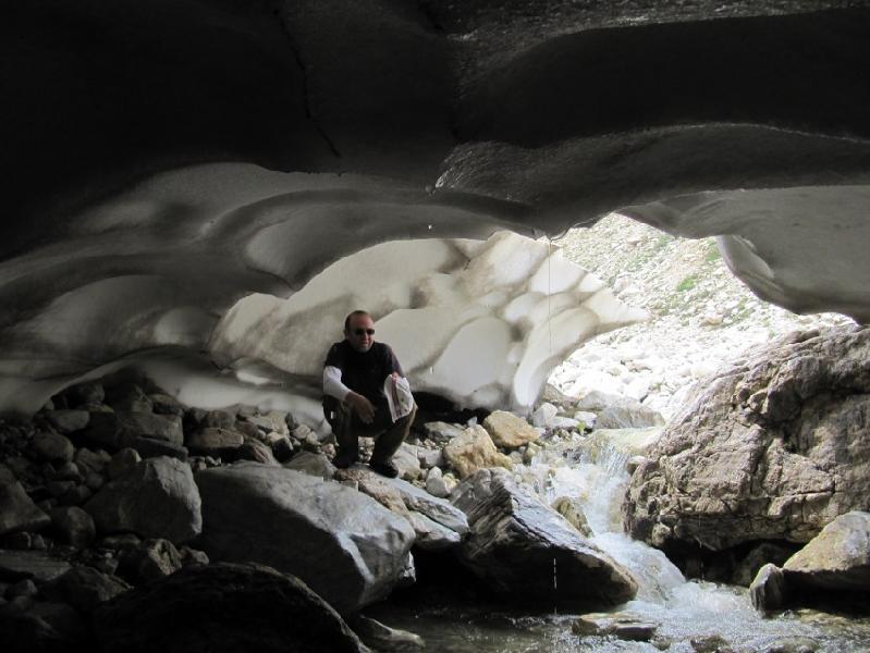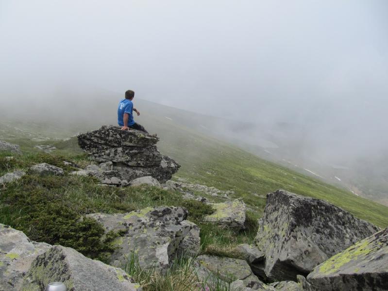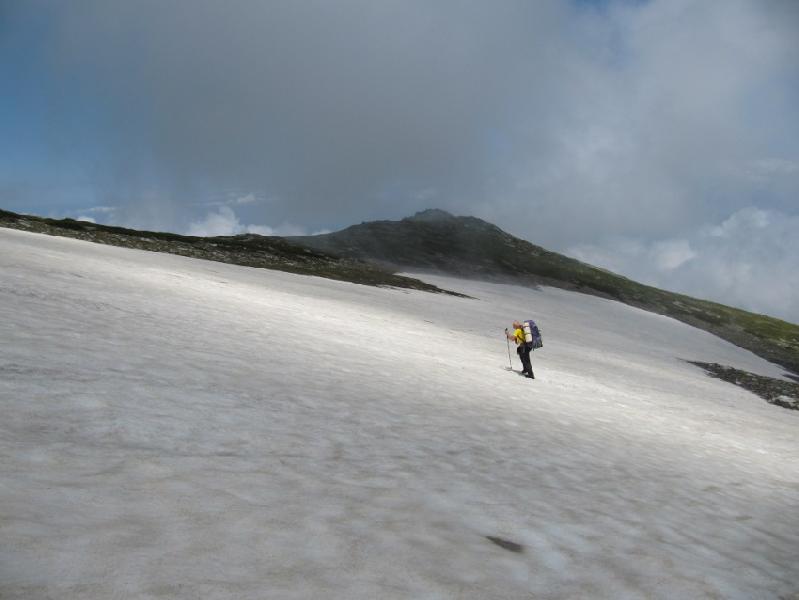 Tam bu bölgeden dereye inen bir patika varmış, ama biz onu kaçırdık, yinede aynı yerden inmemiz isabetli bir karar oldu. Akdere’nin içinde dereyi kapatan buzul, fotoğraf çekmek ve dinlenmek için iyi bir mola yeri oldu. Moladan sonra olduğumuz yerden sırta yükseldik. Bembeyaz sis her yanımızı sardı.